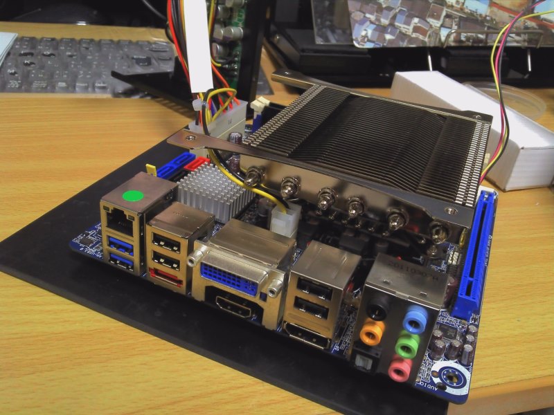 羅刹ファンレスの高さ。写真右側(見えないけど)いい感じに側面ファンが当たってるような感じ。写真左上のPCIスリット及び左壁向こうにある電源ファンから排気。