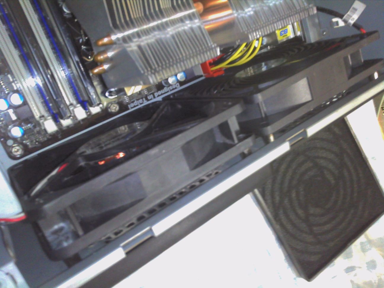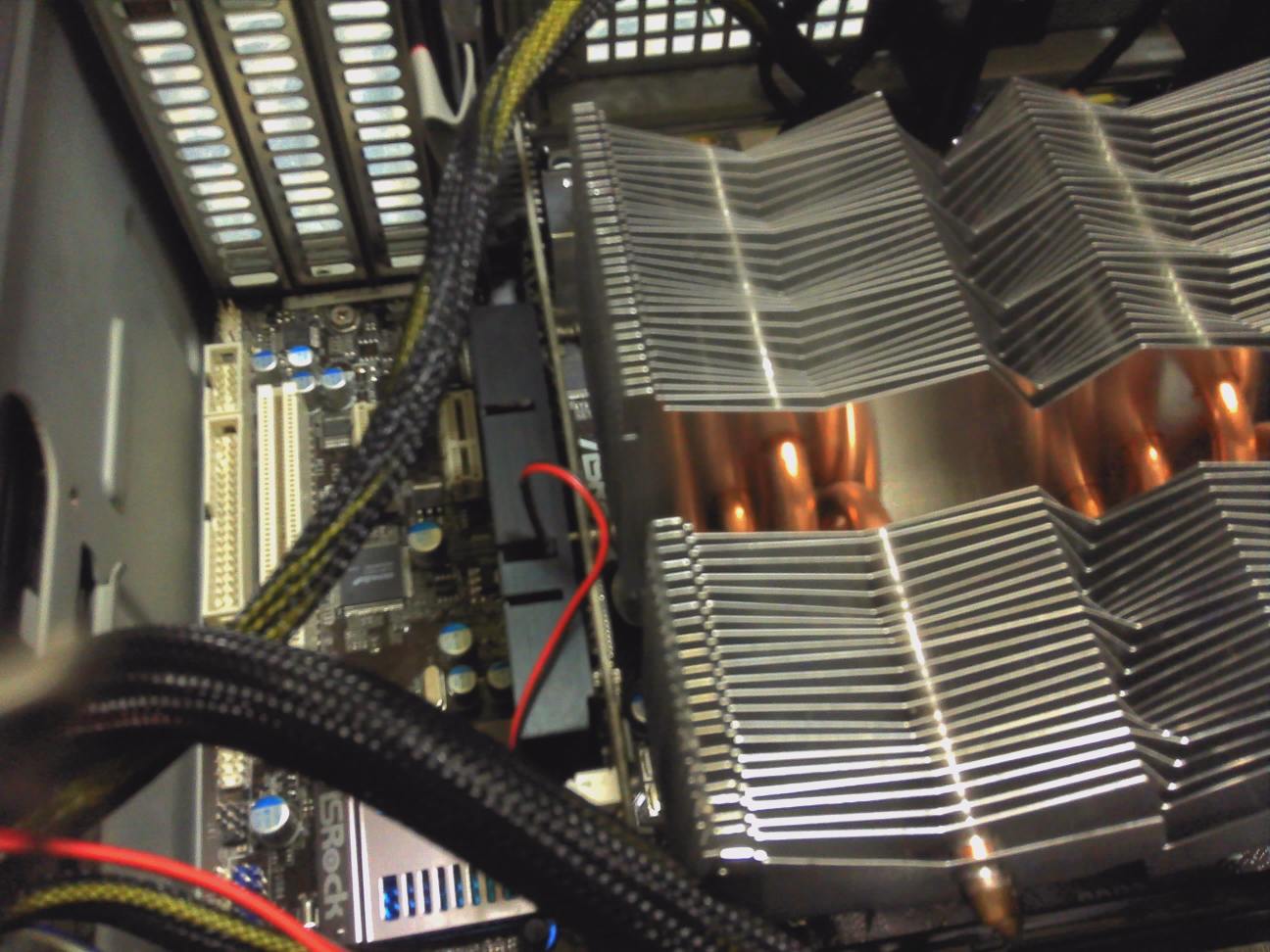 羅刹ファンレスの高さ。写真右側(見えないけど)いい感じに側面ファンが当たってるような感じ。写真左上のPCIスリット及び左壁向こうにある電源ファンから排気。